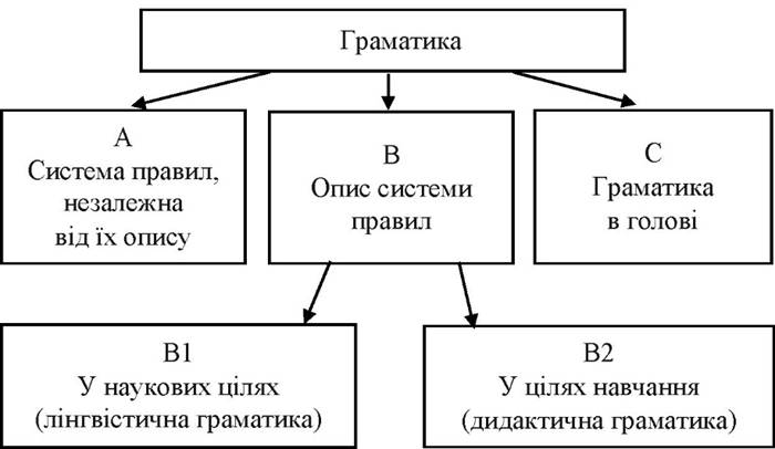 Отже, граматичні знання: виникає питання, що саме повинні вчити учні. Досить чітку відповідь знаходимо у німецького лінгвіста Г Хельбіга, який виділяє три види граматики - А, В і С: