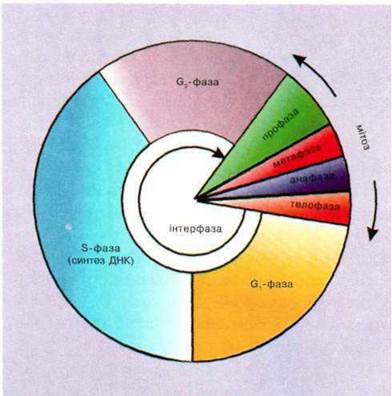 Клітинний цикл складається з інтерфази, мітозу і цитокінезу (рис. 1.73). Тривалість клітинного циклу в різних організмів різна.