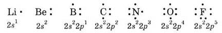 Порівняємо електронну будову атомів Карбону і його сусідів по 2-ому періоду. Електрони в атомах цих елементів розташовуються на двох енергетичних рівнях. Перший рівень усіх атомів однаковий, його формула 1s2. Відрізняється другий рівень: