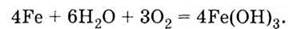 За звичайних умов вода не діє на залізо. Однак, у присутності кисню реакція проходить: