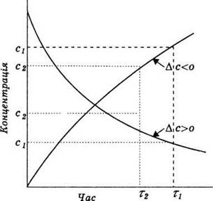 Рис. 43. Зміна концентрації реагентів с1 і продуктів реакції с2 в часі.