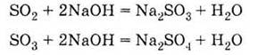 1. За звичайних умов SO2 — газ, SO3 — тверда речовина 2. Проявляють властивості кислотних оксидів, взаємодіючи з водою: