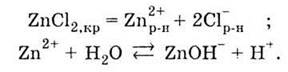 При взаємодії з водою солі, до складу якої входить катіон слабкої основи, останній взаємодіє з водою, утворюючи слабкий електроліт і зв’язуючи при цьому іони ОН-. Розчин такої солі — кислий. Наприклад, у водному розчині хлориду цинку відбуваються процеси: