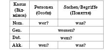 Wer antwortet? (Хто відповідає?) Der Schüler antwortet. (Учень відповідає.) Was steht an der Ecke? (Що стоїть у кутку?) Der Fernseher steht da. (Там стоїть телевізор.) Was ist deine Mutter von Beruf? (Хто твоя мати за професією?) Sie ist Programmiererin. (Вона програміст.) Wessen Buch ist das? (Чия це книга?) Wem gehört das Heft? (Кому належить зошит?)