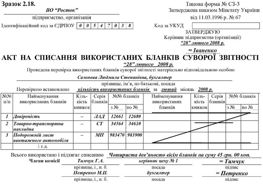 Для списання використаних бланків суворої звітності з підзвіту матеріально-відповідальних осіб застосовується “Акт на списання використаних бланків суворої звітності” (форма № СЗ-З), який складається спеціально створеною комісією. Типова Форма акта наведена у зразку 2.18.