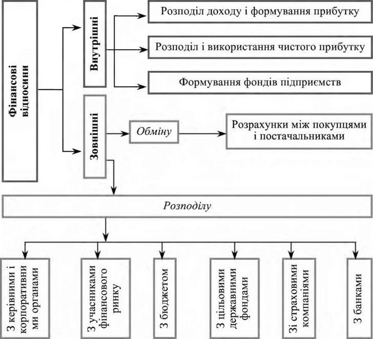 У процесі підприємницької діяльності підприємства вступають у господарські відносини зі своїми контрагентами: постачальниками і покупцями, партнерами по суспільній діяльності, об’єднаннями й асоціаціями, фінансово-кредитною системою, внаслідок яких виникають фінансові відносини, пов’язані з організацією виробництва і реалізацією продукції, формуванням фінансових ресурсів, здійсненням інвестиційної діяльності, податкових платежів у бюджет і цільові фонди, внутрішньовиробничим розподілом доходів тощо.