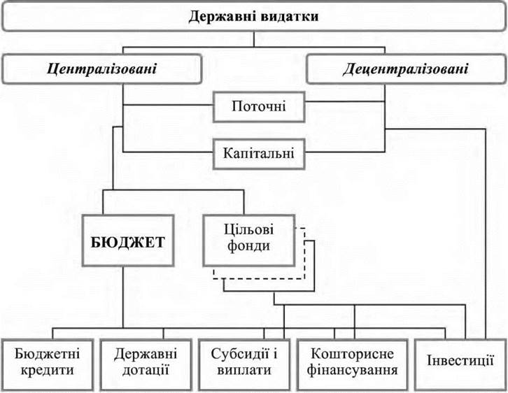 Відповідно до рівня розміщення державні видатки поділяють на централізовані (з бюджету і фондів цільового призначення) і децентралізовані (рис. 5.3).