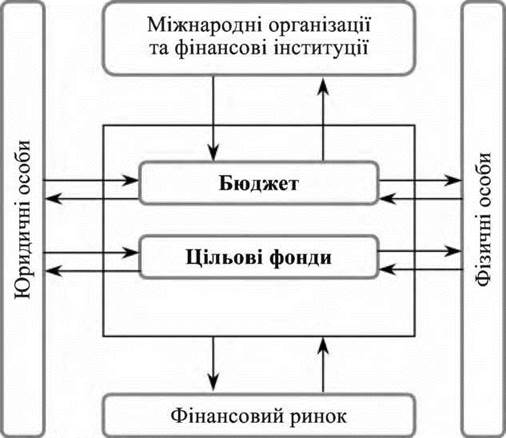 У системі зовнішніх відносин сфери державних фінансів пріоритетними є взаємовідносини з юридичними і фізичними особами. Це, з одного боку, сплата податків та інших обов’язкових платежів до бюджету, купівля державних цінних паперів, внески в цільові фонди, з іншого — асигнування і виплати з бюджету і цільових фондів, повернення боргів та виплата відсотків за позиками. Через бюджет забезпечуються міжнародні фінансові відносини держави — платежі до міжнародних організацій і фінансових інституцій та надходження від них. Тимчасово вільні кошти бюджету, і насамперед цільових фондів, можуть розміщуватись на фінансовому ринку, внаслідок чого формуються відповідні доходи.
