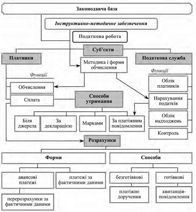 Податкова робота, що є основою організації справляння податків, являє собою діяльність платників і податкової служби щодо внесення податків до бюджету і контролю за платежами. Вона включає такі елементи: правове регламентування встановлення і справляння податків, облік платників і надходжень податків, порядок та форми розрахунків із бюджетом. Податкова робота ґрунтується на встановленні функцій і прав платників і податкової служби, пов’язаних зі своєчасністю і правильністю розрахунків із бюджетом. На платників покладаються функції обчислення і сплати податків, а на податкову службу — обліку платників і надходжень податків, здійснення нарахувань окремих видів податків (наприклад, земельного) і проведення контролю за дотриманням податкового законодавства.