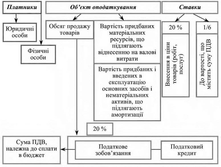Податок на додану вартість (ПДВ) належить до непрямих податків і є видом універсального акцизу, який встановлюється за єдиною ставкою до всього обороту. Він сплачується до державного бюджету на кожному етапі виробництва продукції товарів, виконання робіт, надання послуг, за умов імпорту товарів до або під час митного оформлення. Така роль ПДВ визначається тим, що йому властива висока еластичність: зміна кон’юнктури ринку і рівня цін має незначний вплив на податкову базу, оскільки ПДВ встановлюється у вигляді відсоткової надбавки до цін. Систему справляння ПДВ показано на рис. 8.8.