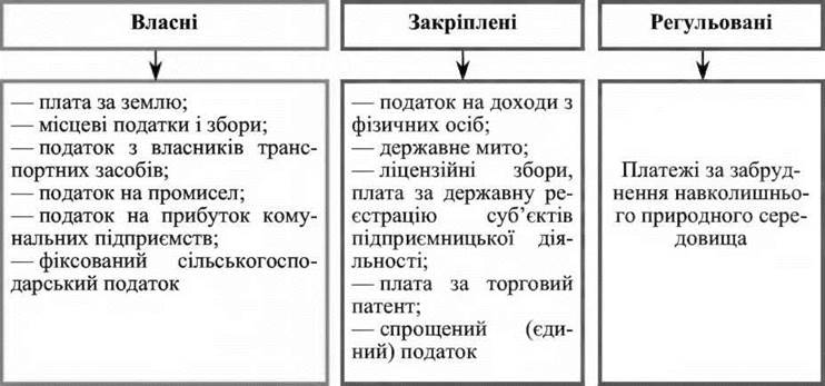 За економічною природою доходи місцевих органів влади поділяються на власні, закріплені (передані місцевій владі) і регульовані (рис. 10.1).
