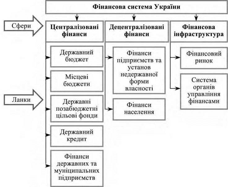 Усі сфери фінансової системи поділяють на окремі ланки, що мають тісні багатосторонні взаємозв’язки. Кожна сфера та ланка фінансової системи посідає певне місце в регулюванні фінансових відносин, визначально впливає на процес відтворення, має свої, властиві тільки їй, функції.