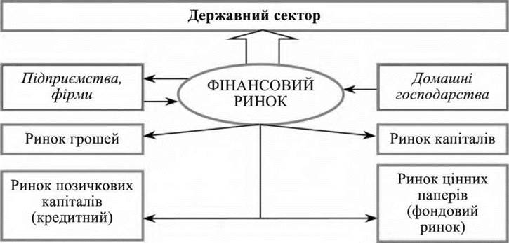 Фінансовий ринок як сфера фінансової системи включає ринок грошей, кредитних ресурсів, цінних паперів і фінансових послуг тощо (рис. 2.3).