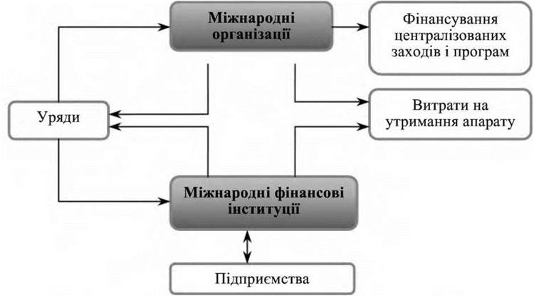 Міжнародні фінансові інституції мають взаємовідносин як з урядами, так і з суб’єктами господарювання окремих країн. Взаємовідносини з урядами складаються за двома напрямами. Перший відображає процес формування статутного капіталу за рахунок внесків окремих країн. Другий характеризує кредитні взаємовідносини — надання кредитів окремим країнам та їх погашення і сплату відсотків. Взаємовідносини з підприємствами теж мають двосторонній характер. Міжнародні фінансові інституції, здійснюючи фінансове забезпечення певних проектів, надають кредити окремим підприємствам, як правило, на конкурсній основі.