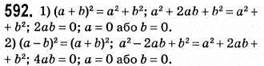 593. 1) (a + b)2 + (a - b)2 = 2(a2 + b2) — тотожність; a2 + 2ab + b2 + a2 - 2ab + b2 = 2(a2 + b2); 2a2 + 2b2 = 2a2 + 2b2 — правильна рівність.