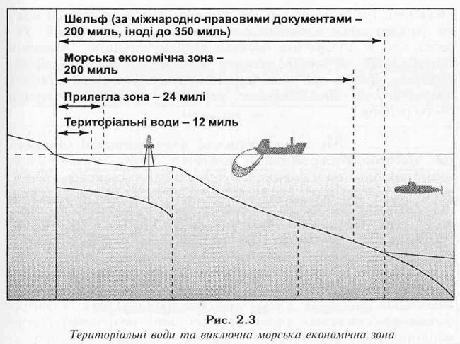 Виключна морська економічна зона, щодо якої прибережна держава має широкі повноваження економічного характеру, простягається на відстань 200 миль від берега і на глибину 500 м шельфу та материкового схилу. Вона перебуває під контролем прибережної держави, яка має виключне право вести тут економічну діяльність (ловити рибу, добувати мінеральну сировину, вести наукові дослідження, вживати заходів щодо захисту морського середовища) та дозволяти таку діяльність іншим країнам на основі економічних угод (рис. 2.3). Але інші держави користуються в цій зоні, так само як у відкритому морі, свободою судноплавства, польотів над нею, прокладення кабелів та підводних трубопроводів. Активно ведуться риболовля та інші морські промисли.