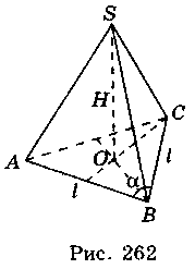 1. 3)  В основі піраміди лежить рівнобедрений трикутник з бічною стороною l і кутом а при вершині (рис. 262). Висота піраміди дорівнює Н, основа висоти піраміди — центр кола, описаного навколо основи піраміди.