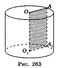 На рис. 263 зображено циліндр, утворений обертанням плоского прямокутника ОАВО1 навколо прямої ОО1 — осі циліндра.