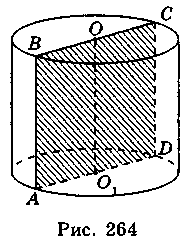 Осьовий переріз циліндра — прямокутник зі сторонами, що дорівнюють висоті циліндра й діаметру його основи. На рис. 264 прямокутник ABCD — осьовий переріз циліндра.