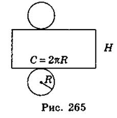 Якщо поверхню циліндра розрізати по колах основ і одній із твірних, а потім розгорнути на площині, то дістанемо розгортку циліндра (рис. 265). Вона складається з прямокутника, сторони якого дорівнюють довжині кола основ і висоті циліндра, і двох кругів, що є основами циліндра.