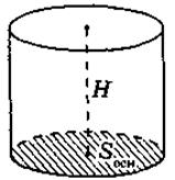 Об'єм циліндра дорівнює добутку площі його основи на висоту V = Sосн ∙ H.