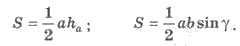 Площа трикутника S (мал. 273) обчислюється за такими формулами (а, b, с - сторони трикутника; h а - висота, проведена до сторони а; γ - кут між сторонами а і b):