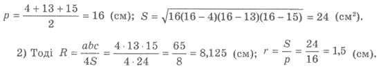 Приклад 3. Сторони трикутника дорівнюють 4 см, 13 см і 15 см. Знайдіть радіус кола R, описаного навколо трикутника та радіус кола r, вписаного в трикутник.