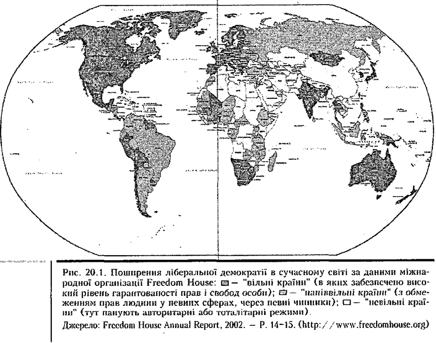 На початку 90-х років сталися події, до яких можна застосувати поняття «вперше в історії людства». Вперше в історії потенціал демократичних держав у світі переважив потенціал держав авторитарних. Ще 225 років тому світ складався винятково з авторитарних режимів. Від часу утворення США і до кінця XIX ст. число демократичних держав зросло до 13. За першу половину XX ст. їх кількість подвоїлась. У 1992 р., за даними організації «Фрідом Хаус», у 91-й із 183 держав світу вже існували електоральні демократії (тобто уряди тут обиралися народом), налічувалось 76 держав з високим рівнем гарантованих прав і свобод особи. А ще через 10 років, у 2002 р. за даними цієї ж організації, електоральних демократій стало 121 із 193 країн світу, а держав з гарантованими правами та свободами — 85 (див. карту)2.