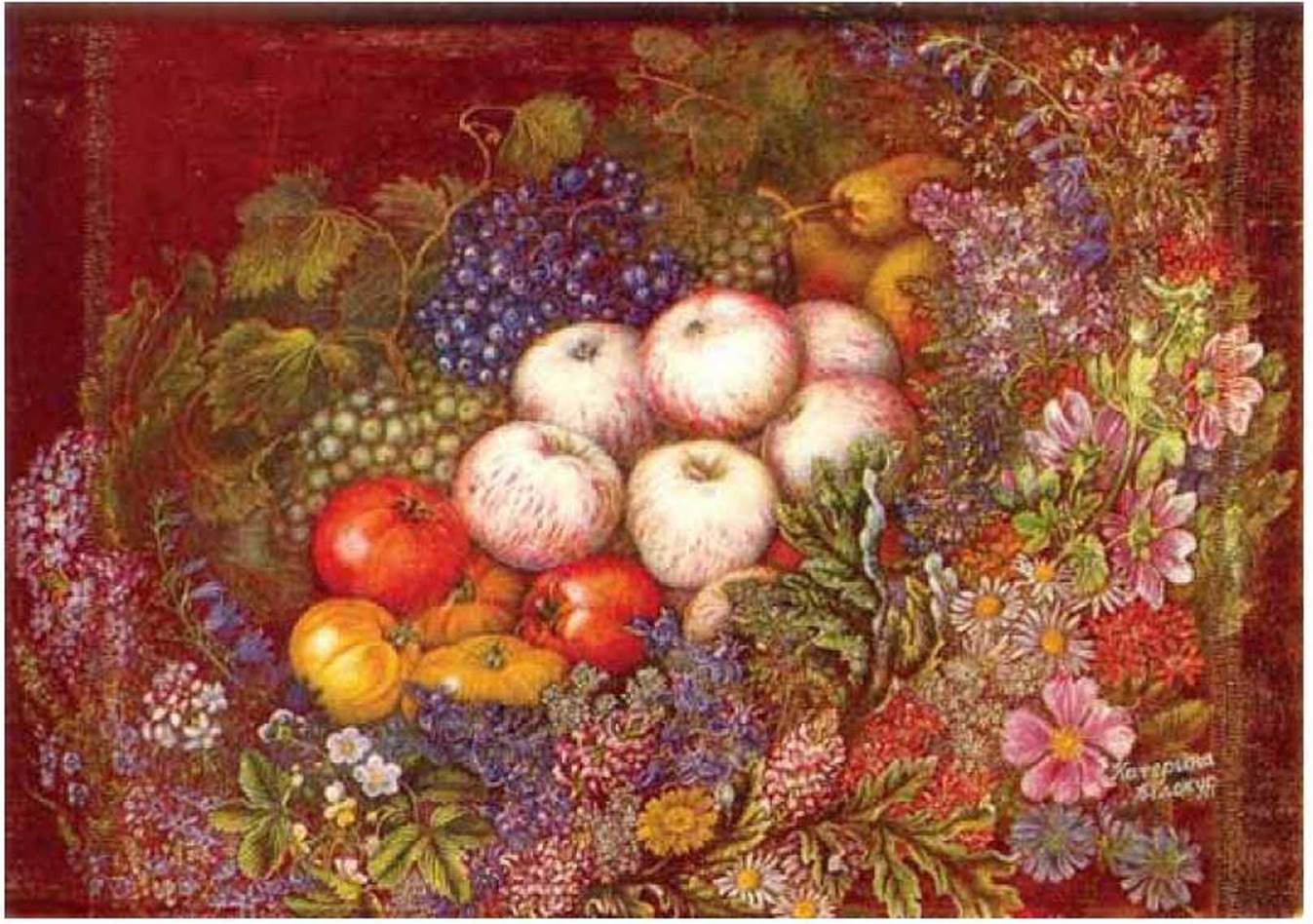У натюрмортах Катерини Білокур, окрім квітів, зображено дари природи, які створюють настрій захоплення від краси рідного краю.