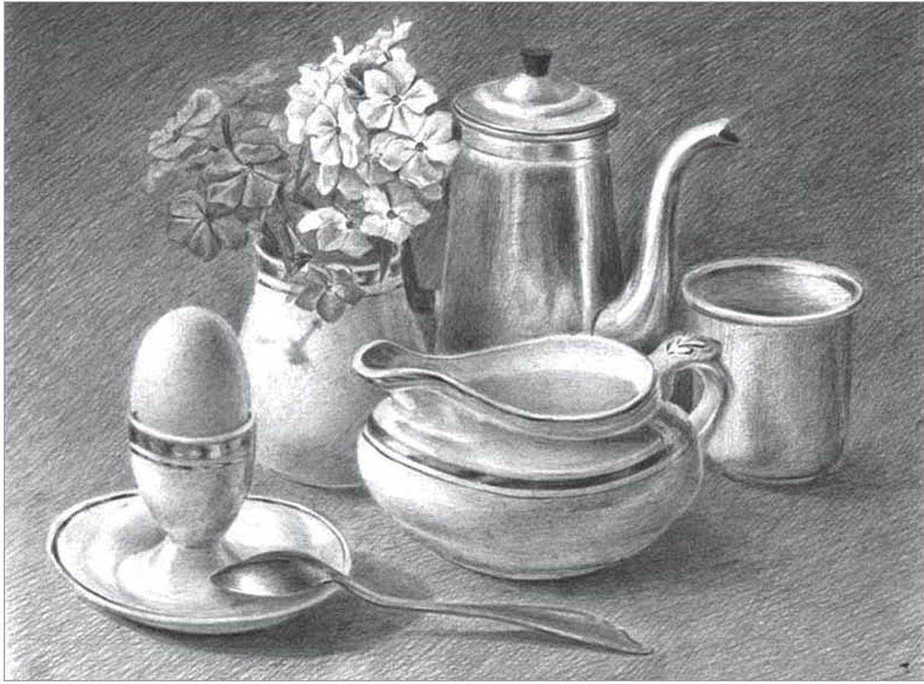 Окресліть на аркуші загальні обриси предметів натюрморту, виділіть головне в композиції. Будуйте натюрморт з урахуванням перспективи. Поступово деталізуйте рисунок і виконуйте зображення в тоні. Передайте особливості форми посуду та його об’єм світлотінню. Предмети на передньому плані промалюйте детально і контрастно. Самостійно оцініть свій натюрморт.