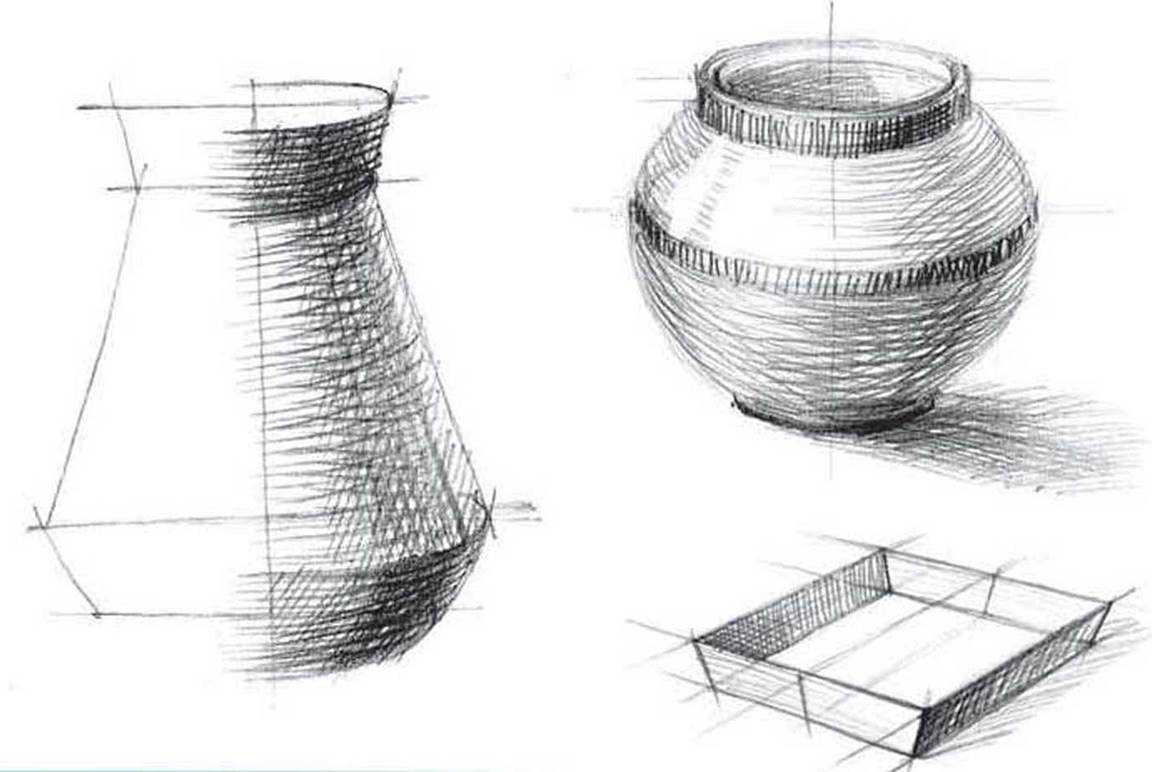 • Пригадайте градації світлотіні на круглих предметах. Погляньте, як вони зображені в перспективі. Зверніть увагу, що штрихи виконуються відповідно до форми предмета.