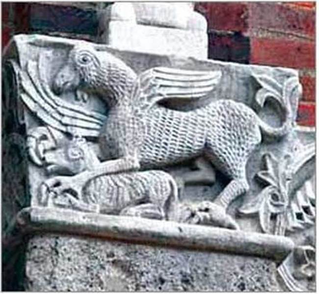 • Роздивіться рельєфи тварин. Які художні засоби використано, щоб надати зображенням фантастичного вигляду? Поміркуйте, у чому виявляється особливість поєднання звірів і птахів у цій композиції.