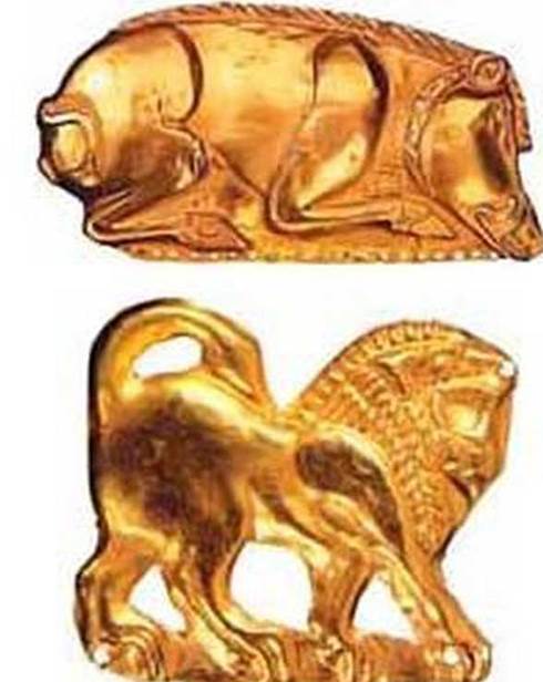 У мистецтві скіфів рельєфи «звіриного стилю» були поширені як золоті прикраси: масивні пекторалі, маленькі фігурки кабанів, левів, оленів, коней, які використовувалися для прикрашання одягу, головних уборів і кінської збруї.