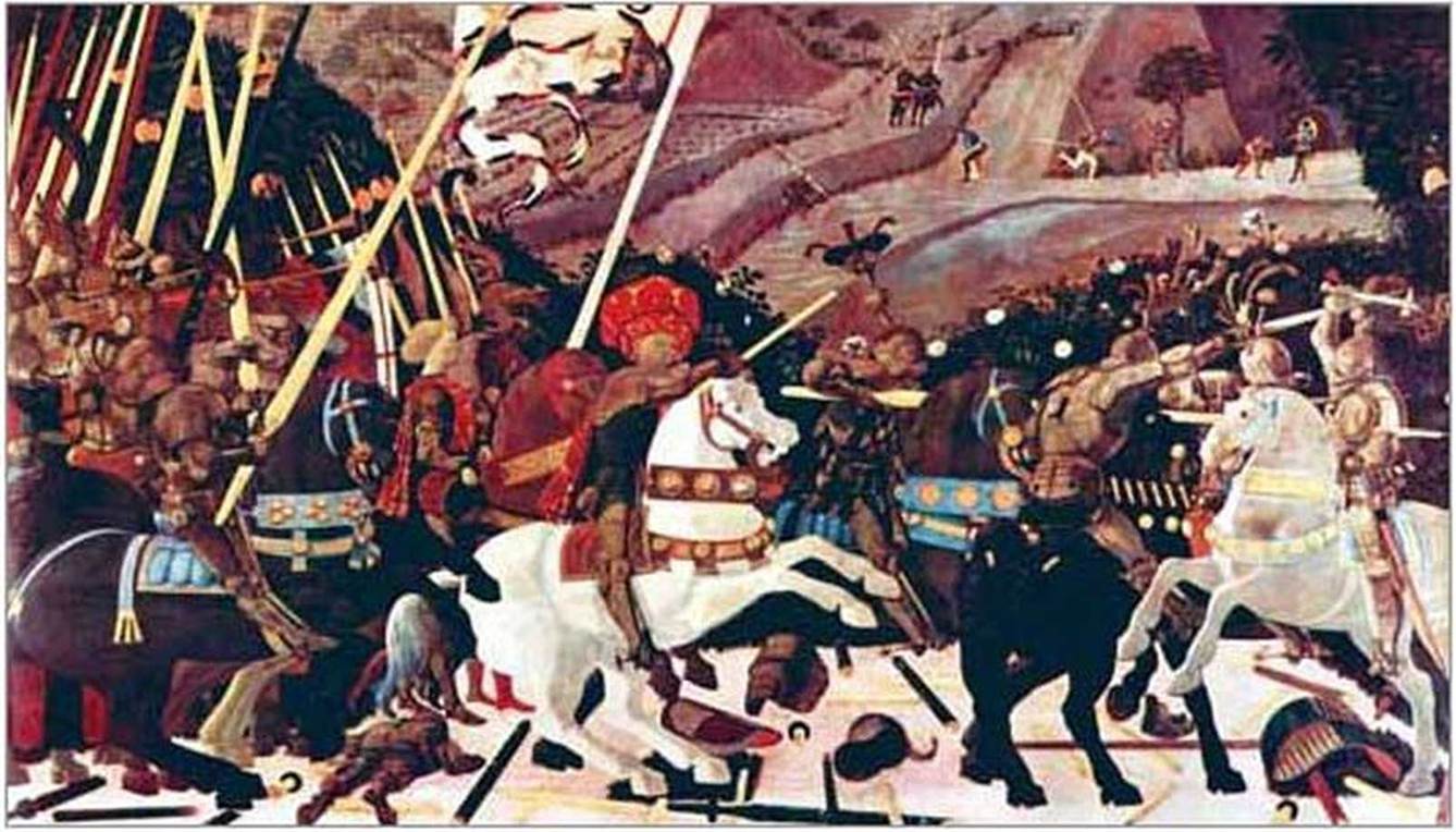 Одним із перших зразків батального жанру е триптих Паоло Учелло «Битва під Сан-Романо», присвячений бойовим діям між Флоренцією і Сієною в 1432 р. Цей твір прикрашав залу в палаці Медічі. Паоло Учелло був одним з тих, хто почав застосовувати перспективу для зображення простору, малювати персонажів у різних ракурсах.