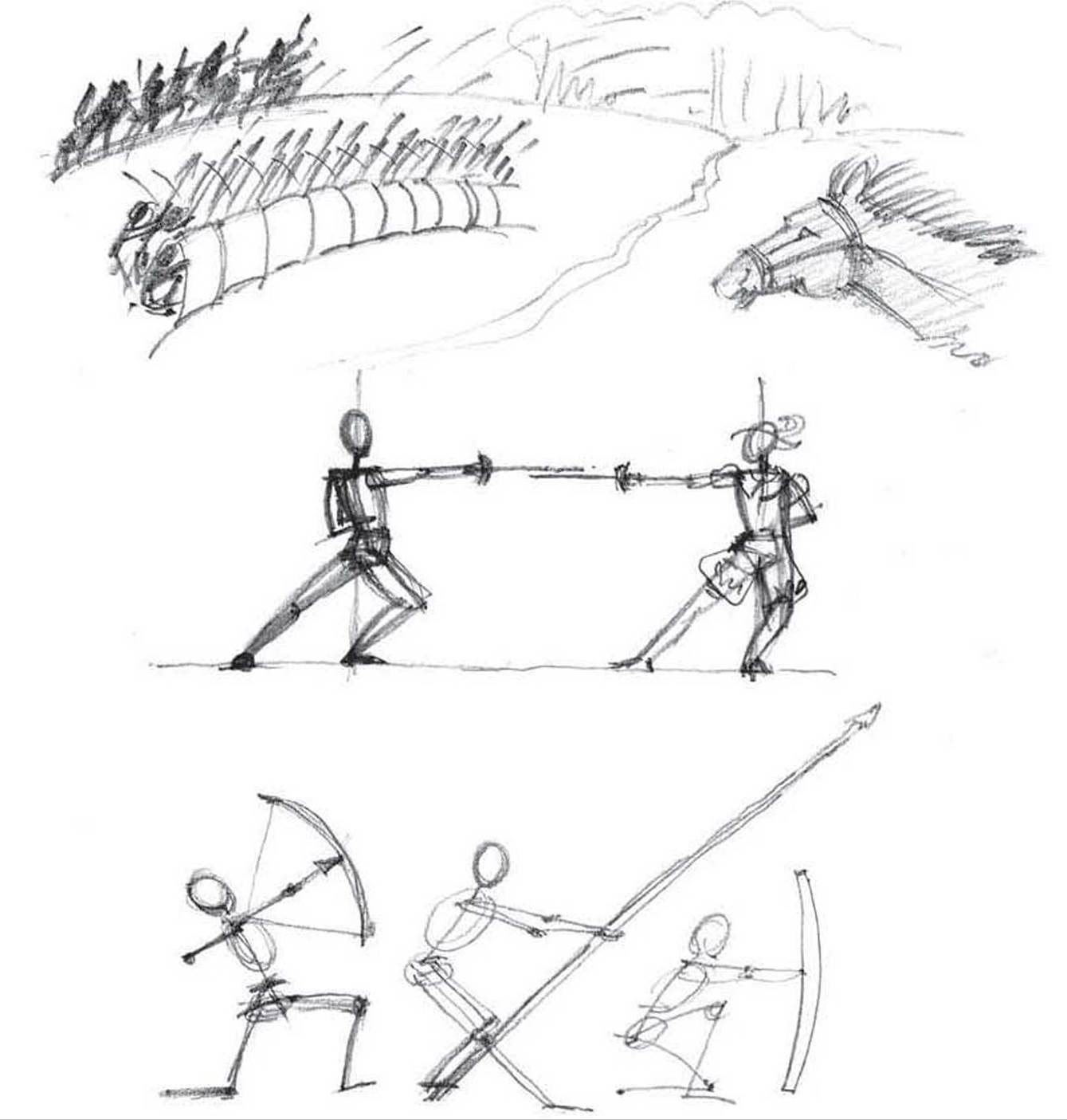 Продумайте сюжет композиції, образи головних персонажів, щоб передати динаміку битви, Спочатку намітьте постаті людей, дотримуючись пропорцій фігури, далі деталізуйте персонажів, одяг, зброю. За допомогою контрасту кольорів, тону виділіть центр композиції. Спробуйте передати емоції персонажів.