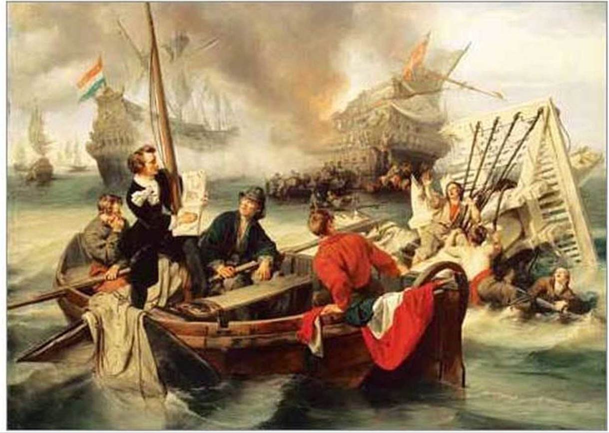 • Розгляньте картини. Зверніть увагу на колірні та світлотіньові контрасти. Як художники посилюють драматизм морської битви, зображаючи шторм, могутність природної стихії?
