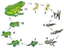 Іл. 104. Розвиток жаби: 1-2 - ікра; 3-9 - стадії розвитку пуголовка; 10-11 - доросла стадія