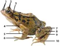 5. Визначте назви позначених на малюнку основних елементів зовнішньої будови жаби.