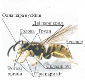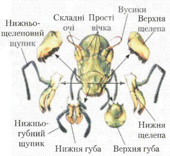 2. Зовнішня будова комах. Тіло комах складається з голови, грудей і черевця (рис. 13.2). На голові міститься єдина пара вусиків, що є органами нюху та дотику. По боках голови більшості комах розташовані складні очі (рис. 10.4). Крім них, на голові можуть бути й прості вічка, які визначають рівень освітленості.