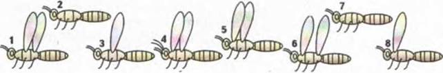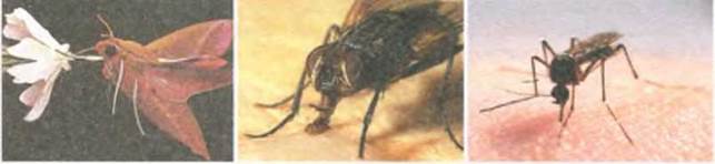 Рис. 13.4. Зліва направо: метелик бражник п’є нектар; муха лиже згущене молоко; комар ссе кров. Будова ротових апаратів цих комах відповідає їхньому способу живлення.