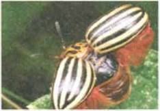 Чи відоме вам слово «шкідник»? Що воно означає? Рослиноїдні комахи можуть істотно впливати на штучні екосистеми, які створює людина, — поля, сади, городи, лісопосадки. Ми часто називаємо їх «шкідниками», бо вони псують і знищують урожаї, і ведемо проти них справжню війну. На жаль, отрутохімікати вражають не тільки ці види, а й інші, і нас самих. Насправді «шкідник» — небажаний для нас вид, який надмірно розмножився в умовах сільського господарства. Таким є, наприклад, колорадський жук (рис. 13.5). Щоб комахи-«шкідники» не завдавали нам збитків, треба обмежувати їхню чисельність за допомогою охоронних заходів, які не порушують середовища існування інших видів. Одним із таких заходів є біологічний контроль: використання одних видів для обмеження чисельності інших (рис. 13.6).