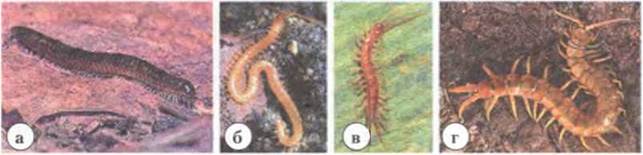 Рис. 13.8. Поширені в Україні багатоніжки: ківсяк(а); геофіл(б); кістянка (в); сколопендра, що мешкає на Півдні України (г)