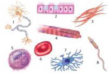 Іл. 4. Різноманітність клітин людини: 1 - нейрон; 2 - епітеліальні клітини - епітеліоцити; 3 - міоцити; 4 - м'язове волокно; 5 - лейкоцит; 6 - еритроцит;