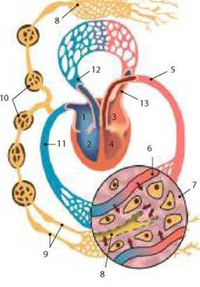 7- тканинна рідина; 8 - лімфатичні капіляри, в які відбувається транспорт речовин із тканин; 9, 10 - лімфатична система; 11, 13 - вени, якими кров тече до серця