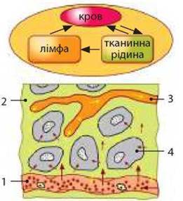 Іл. 38. Внутрішнє середовище організму: 1 - кров; 2 - тканинна рідина; 3 - лімфа; 4 - клітини