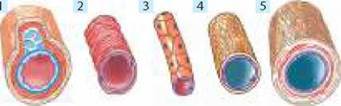 Іл. 51. Кровоносні судини: 1 - артерії; 2 - артеріоли; 3 - капіляри; 4 - венули; 5 - вени