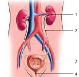 Іл. 56. Будова нирки: 1 - сечовід; 2 - ниркова вена; 3 - ниркова артерія; 4 - ниркова миска;