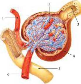 1 - приносна артеріола; 2 - клубочкові капіляри; 3 - звивистий каналець першого порядку; 4 - капсула нефрона;