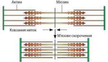 - за допомогою поперечних містків у присутності йонів Са2+ відбувається втягування тонких ниток актину в проміжки між товстими нитками міозину;