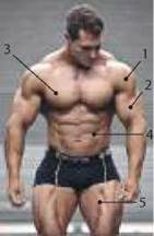 Зіставте позначені на ілюстрації м’язи з назвами та вкажіть їхнє значення для людини: чотириголовий м’яз, прямий м’яз, великий грудний м’яз, дельтоподібний м'яз, двоголовий м'яз